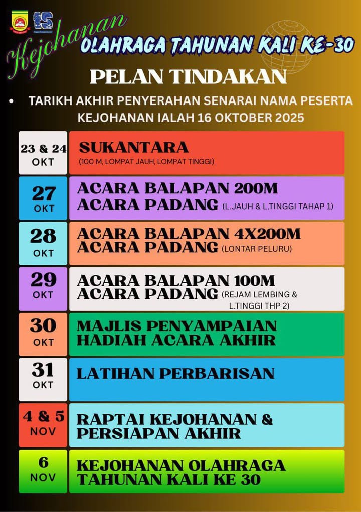????Sepanjang tarikh-tarikh tersebut diminta semua murid memakai *pakaian sukan sekolah dan berkasut.*